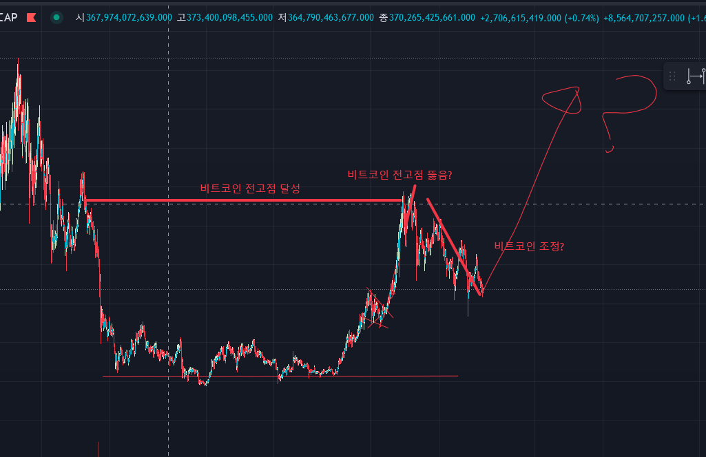 (혹은 2번의 전고를 뚫는 모습이 제대로 안나왔을 수도 있음 그러나 비트 시총이 무거워지면서 그럴 수 있다고 봄)