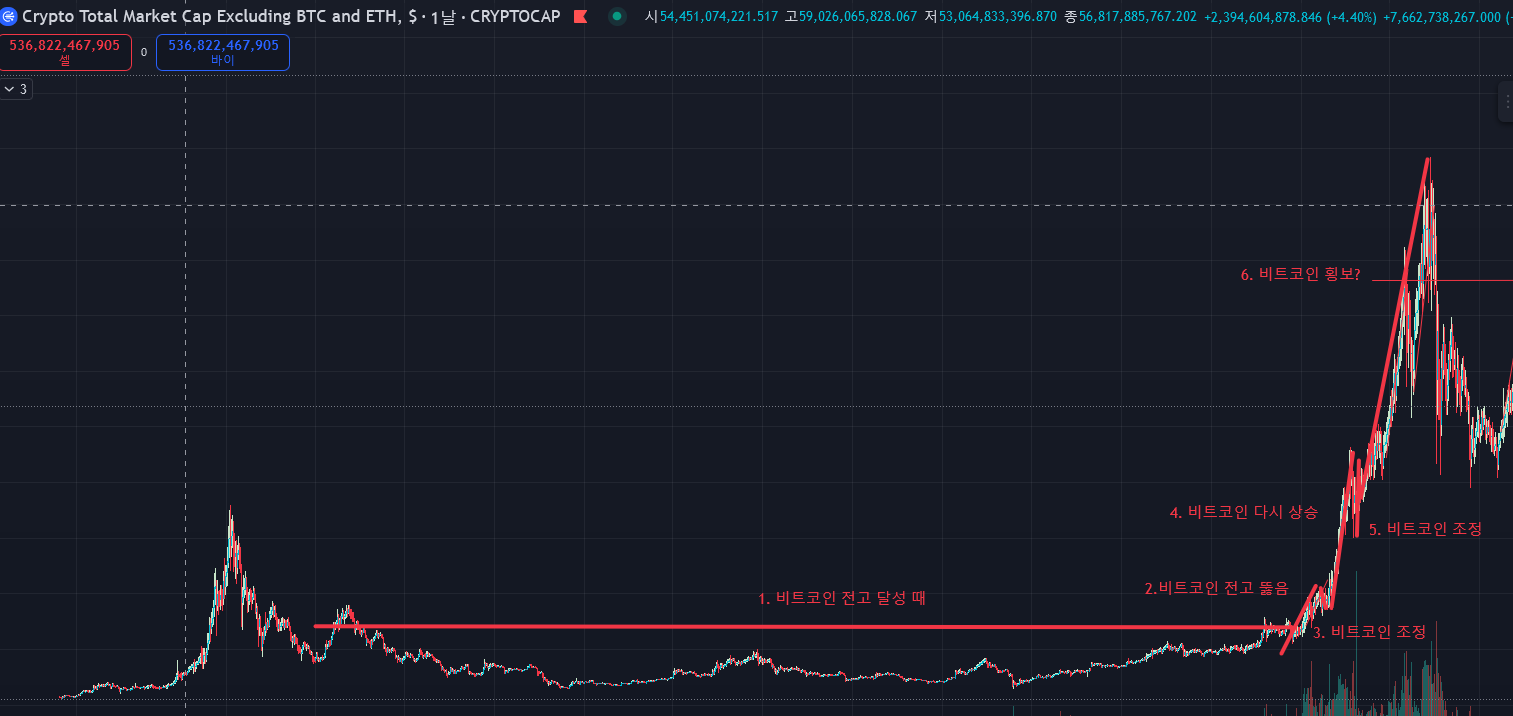 2. 비트코인이 전고를 뚫으면 알트들(TOTAL3)도 어느정도 전고 근처까지 오름