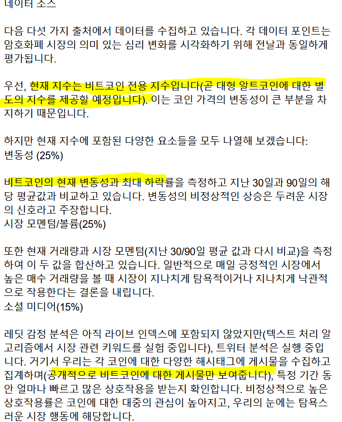 위의 alternative의 지수와는 다르게 상위시총 10개의 코인과 eth의 변동률까지 포함된 데이터를 사용하고 있는 것을 볼 수 있음